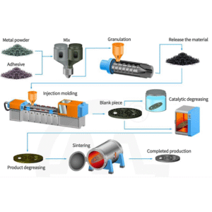 The granulated metal powder is then fed into an injection molding machine, where it is heated and injected into a mold cavity under high pressure. This process creates a green compact, which is the shape of the part before it undergoes further processing.